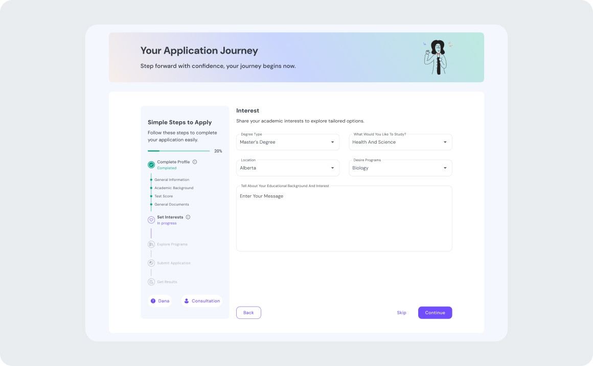 Yes! Our smart assistant Dana analyzes your profile and recommends programs that match your academic background, goals, and interests, all in just a few clicks.